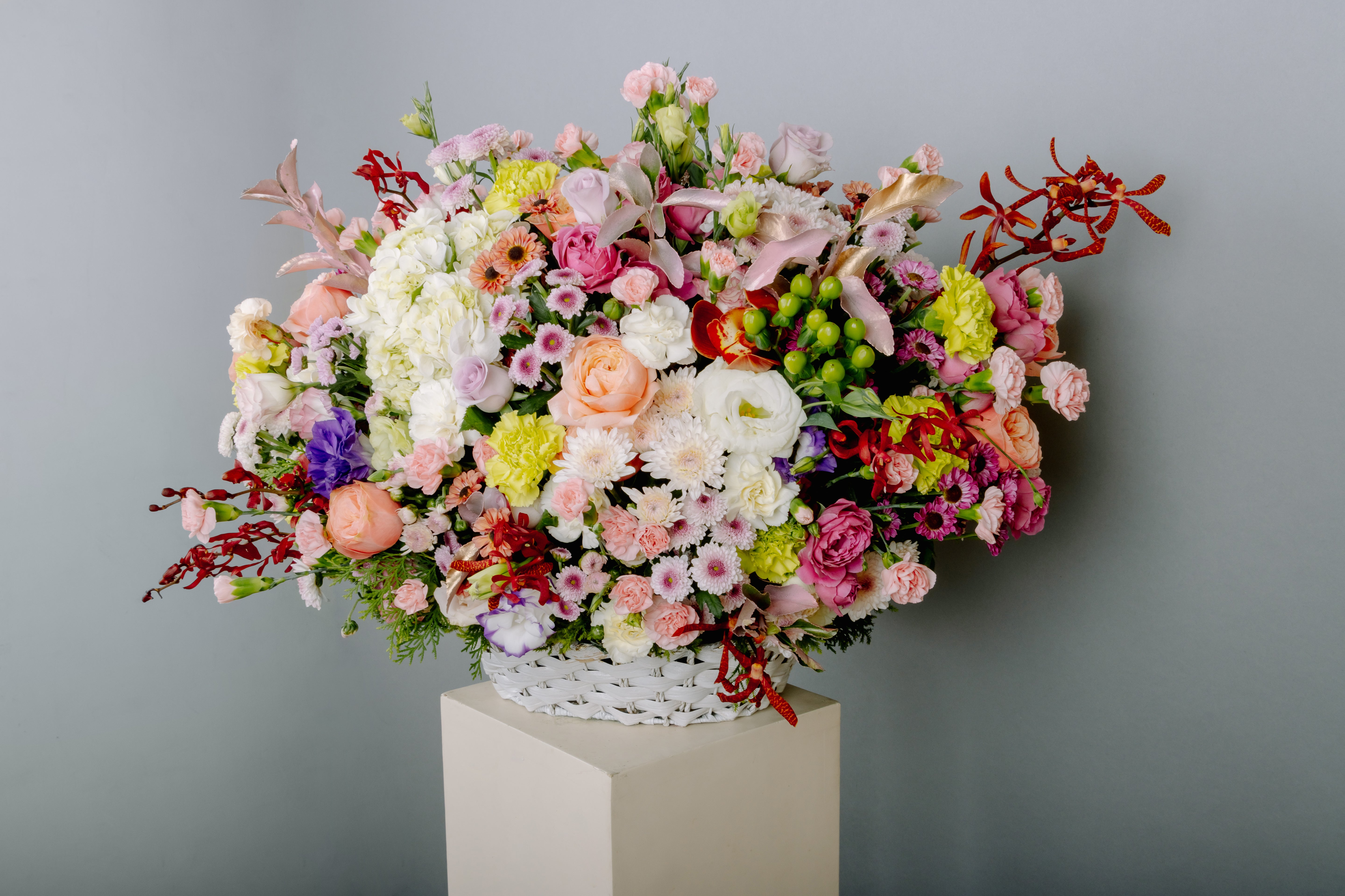 • Flower Recipe: Hydrangea, Carnation, Daisy, Chrysanthemum, Eustoma, Spray Carnation, Rose, Spider Orchid, Gypsophila, foliage.